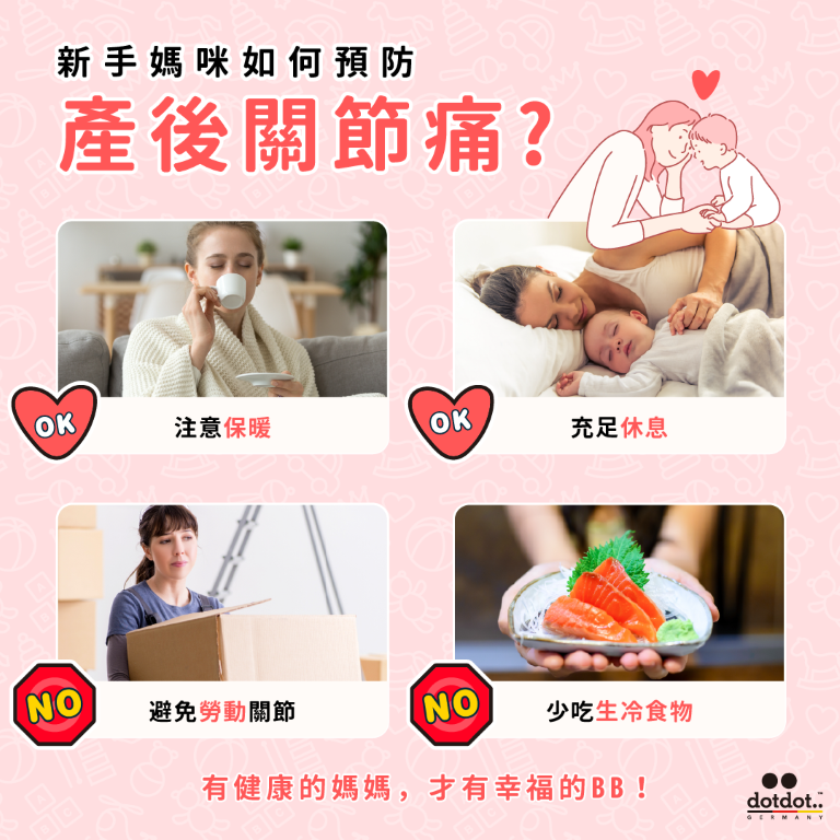 新手媽咪常常因照顧 BB,忘記也要好好照顧自己。記得注意保暖,避免吹風讓關節著涼。平日要有充足休息,避免勞動關節的行為如蹲下、站立。最後少吃傷筋骨的生冷食物,並保持心平氣和,讓身體及精神也保持最佳狀態。有健康的媽媽,才有幸福的 BB!
